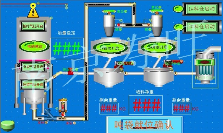 此控制系統為:噸袋卸料站+計量+輸送+除塵為一體的自動化設計方案。